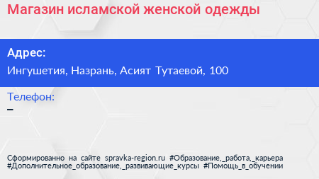 Магазин исламской женской одежды по адресу Ингушетия, Назрань, Асият Тутаевой, 100 в дальнейшем Организация, размещена в следующих категориях: