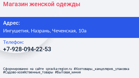 Магазин женской одежды по адресу Ингушетия, Назрань, Чеченская, 10а в дальнейшем Организация, размещена в следующих категориях:
