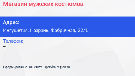 Магазин мужских костюмов по адресу Ингушетия, Назрань, Фабричная, 22/1 в дальнейшем Организация, размещена в следующих категориях: