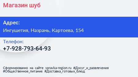 Магазин шуб по адресу Ингушетия, Назрань, Картоева, 154 в дальнейшем Организация, размещена в следующих категориях: