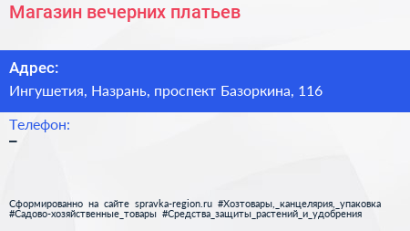 Магазин вечерних платьев по адресу Ингушетия, Назрань, проспект Базоркина, 116 в дальнейшем Организация, размещена в следующих категориях: