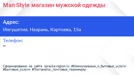 Man Style, магазин мужской одежды по адресу Ингушетия, Назрань, Картоева, 15а в дальнейшем Организация, размещена в следующих категориях: