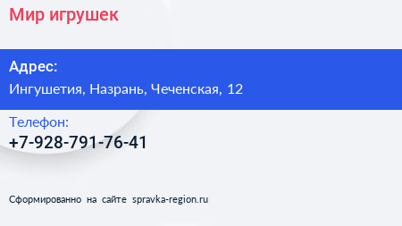 Мир игрушек по адресу Ингушетия, Назрань, Чеченская, 12 в дальнейшем Организация, размещена в следующих категориях: