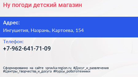 Ну, погоди!, детский магазин по адресу Ингушетия, Назрань, Картоева, 154 в дальнейшем Организация, размещена в следующих категориях: