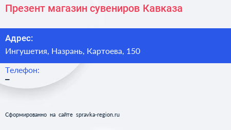 Презент, магазин сувениров Кавказа по адресу Ингушетия, Назрань, Картоева, 150 в дальнейшем Организация, размещена в следующих категориях: