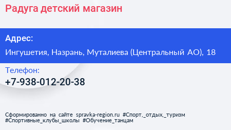 Радуга, детский магазин по адресу Ингушетия, Назрань, Муталиева (Центральный АО), 18 в дальнейшем Организация, размещена в следующих категориях: