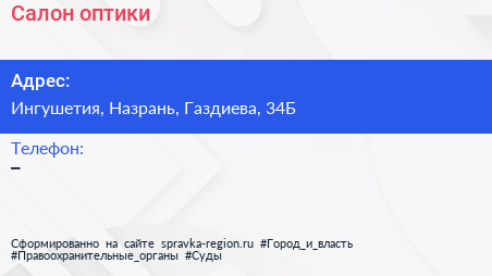 Салон оптики по адресу Ингушетия, Назрань, Газдиева, 34Б в дальнейшем Организация, размещена в следующих категориях: