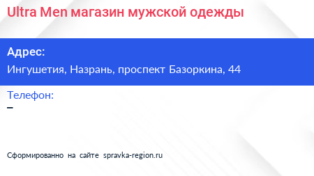Ultra Men, магазин мужской одежды по адресу Ингушетия, Назрань, проспект Базоркина, 44 в дальнейшем Организация, размещена в следующих категориях: