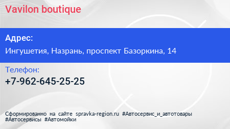 Vavilon boutique по адресу Ингушетия, Назрань, проспект Базоркина, 14 в дальнейшем Организация, размещена в следующих категориях: