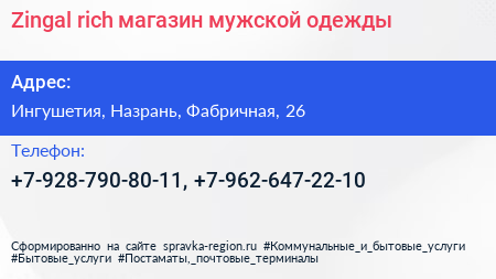 Zingal rich, магазин мужской одежды по адресу Ингушетия, Назрань, Фабричная, 26 в дальнейшем Организация, размещена в следующих категориях: