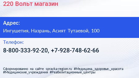 220 Вольт, магазин по адресу Ингушетия, Назрань, Асият Тутаевой, 100 в дальнейшем Организация, размещена в следующих категориях: