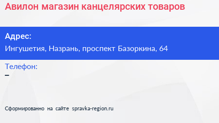 Авилон, магазин канцелярских товаров по адресу Ингушетия, Назрань, проспект Базоркина, 64 в дальнейшем Организация, размещена в следующих категориях: