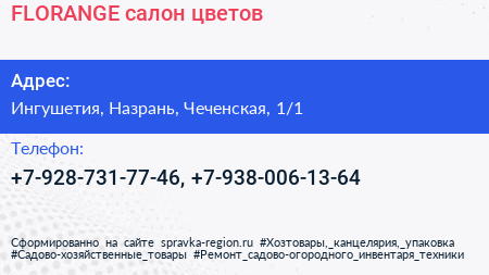FLORANGE, салон цветов по адресу Ингушетия, Назрань, Чеченская, 1/1 в дальнейшем Организация, размещена в следующих категориях: