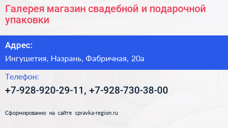 Галерея, магазин свадебной и подарочной упаковки по адресу Ингушетия, Назрань, Фабричная, 20а в дальнейшем Организация, размещена в следующих категориях: