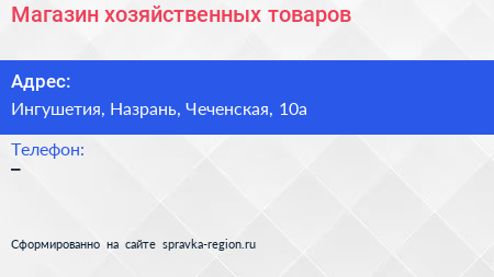 Магазин хозяйственных товаров по адресу Ингушетия, Назрань, Чеченская, 10а в дальнейшем Организация, размещена в следующих категориях: