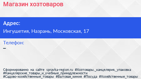 Магазин хозтоваров по адресу Ингушетия, Назрань, Московская, 17 в дальнейшем Организация, размещена в следующих категориях: