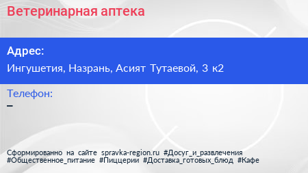 Ветеринарная аптека по адресу Ингушетия, Назрань, Асият Тутаевой, 3 к2 в дальнейшем Организация, размещена в следующих категориях: