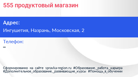 555, продуктовый магазин по адресу Ингушетия, Назрань, Московская, 2 в дальнейшем Организация, размещена в следующих категориях: