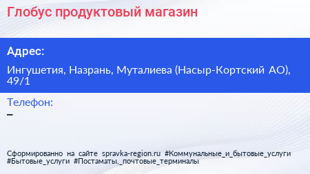 Глобус, продуктовый магазин по адресу Ингушетия, Назрань, Муталиева (Насыр-Кортский АО), 49/1 в дальнейшем Организация, размещена в следующих категориях: