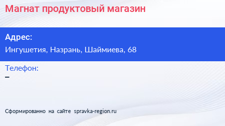Магнат, продуктовый магазин по адресу Ингушетия, Назрань, Шаймиева, 68 в дальнейшем Организация, размещена в следующих категориях: