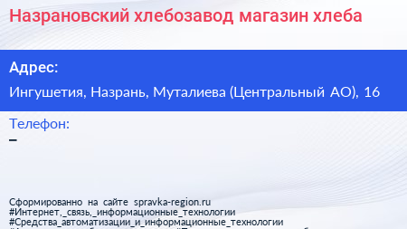 Назрановский хлебозавод, магазин хлеба по адресу Ингушетия, Назрань, Муталиева (Центральный АО), 16 в дальнейшем Организация, размещена в следующих категориях: