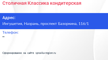 Столичная Классика, кондитерская по адресу Ингушетия, Назрань, проспект Базоркина, 116/1 в дальнейшем Организация, размещена в следующих категориях: