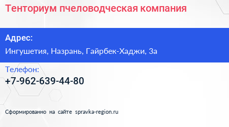 Тенториум, пчеловодческая компания по адресу Ингушетия, Назрань, Гайрбек-Хаджи, 3а в дальнейшем Организация, размещена в следующих категориях: