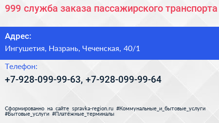 999, служба заказа пассажирского транспорта по адресу Ингушетия, Назрань, Чеченская, 40/1 в дальнейшем Организация, размещена в следующих категориях: