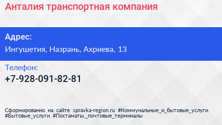 Анталия, транспортная компания по адресу Ингушетия, Назрань, Ахриева, 13 в дальнейшем Организация, размещена в следующих категориях:
