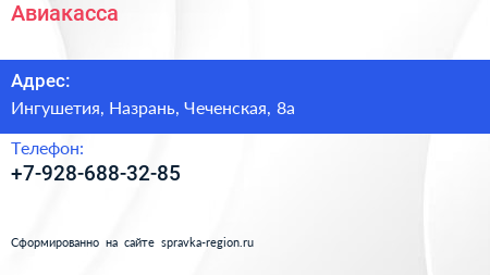 Авиакасса по адресу Ингушетия, Назрань, Чеченская, 8а в дальнейшем Организация, размещена в следующих категориях: