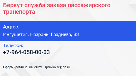 Беркут, служба заказа пассажирского транспорта по адресу Ингушетия, Назрань, Газдиева, 83 в дальнейшем Организация, размещена в следующих категориях: