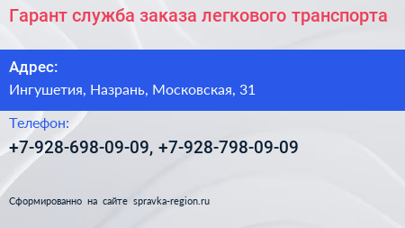 Гарант, служба заказа легкового транспорта по адресу Ингушетия, Назрань, Московская, 31 в дальнейшем Организация, размещена в следующих категориях: