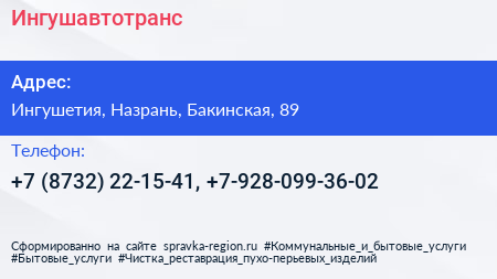Ингушавтотранс по адресу Ингушетия, Назрань, Бакинская, 89 в дальнейшем Организация, размещена в следующих категориях: