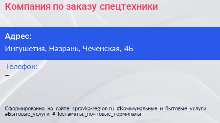 Компания по заказу спецтехники по адресу Ингушетия, Назрань, Чеченская, 4Б в дальнейшем Организация, размещена в следующих категориях: