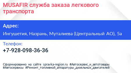 MUSAFIR, служба заказа легкового транспорта по адресу Ингушетия, Назрань, Муталиева (Центральный АО), 5а в дальнейшем Организация, размещена в следующих категориях:
