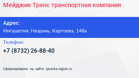 Мейджик Транс, транспортная компания по адресу Ингушетия, Назрань, Картоева, 148а в дальнейшем Организация, размещена в следующих категориях: