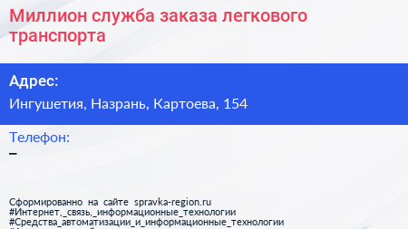 Миллион, служба заказа легкового транспорта по адресу Ингушетия, Назрань, Картоева, 154 в дальнейшем Организация, размещена в следующих категориях: