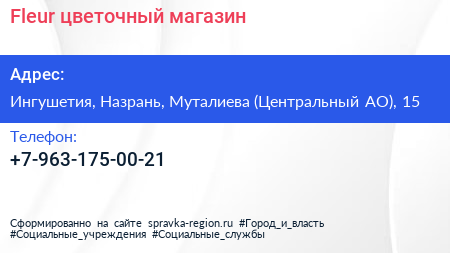 Fleur, цветочный магазин по адресу Ингушетия, Назрань, Муталиева (Центральный АО), 15 в дальнейшем Организация, размещена в следующих категориях: