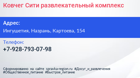 Ковчег-Сити, развлекательный комплекс по адресу Ингушетия, Назрань, Картоева, 154 в дальнейшем Организация, размещена в следующих категориях: