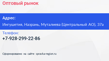 Оптовый рынок по адресу Ингушетия, Назрань, Муталиева (Центральный АО), 37а в дальнейшем Организация, размещена в следующих категориях:
