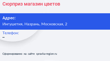 Сюрприз, магазин цветов по адресу Ингушетия, Назрань, Московская, 2 в дальнейшем Организация, размещена в следующих категориях: