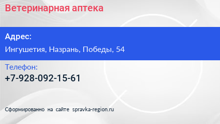 Ветеринарная аптека по адресу Ингушетия, Назрань, Победы, 54 в дальнейшем Организация, размещена в следующих категориях: