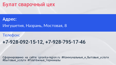 Булат, сварочный цех по адресу Ингушетия, Назрань, Мостовая, 8 в дальнейшем Организация, размещена в следующих категориях: