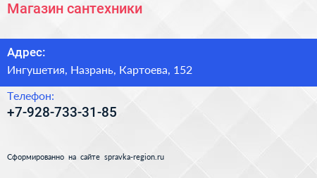 Магазин сантехники по адресу Ингушетия, Назрань, Картоева, 152 в дальнейшем Организация, размещена в следующих категориях: