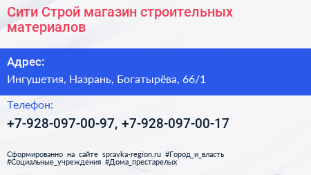 Сити Строй, магазин строительных материалов по адресу Ингушетия, Назрань, Богатырёва, 66/1 в дальнейшем Организация, размещена в следующих категориях: