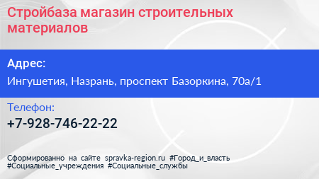 Стройбаза, магазин строительных материалов по адресу Ингушетия, Назрань, проспект Базоркина, 70а/1 в дальнейшем Организация, размещена в следующих категориях: