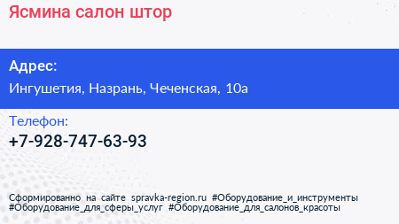 Ясмина, салон штор по адресу Ингушетия, Назрань, Чеченская, 10а в дальнейшем Организация, размещена в следующих категориях: