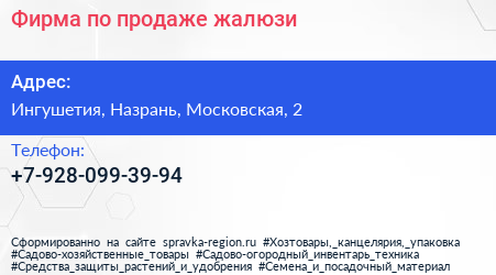 Фирма по продаже жалюзи по адресу Ингушетия, Назрань, Московская, 2 в дальнейшем Организация, размещена в следующих категориях: