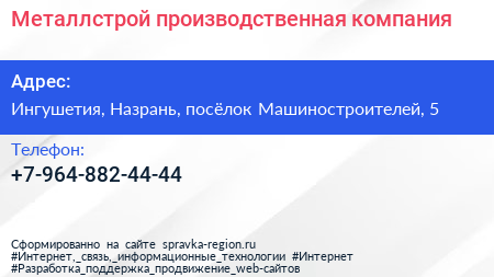 Металлстрой, производственная компания по адресу Ингушетия, Назрань, посёлок Машиностроителей, 5 в дальнейшем Организация, размещена в следующих категориях: