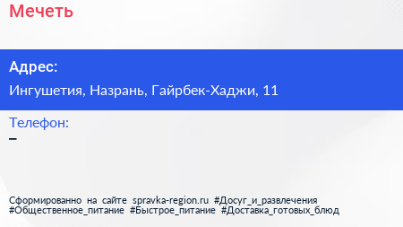 Мечеть по адресу Ингушетия, Назрань, Гайрбек-Хаджи, 11 в дальнейшем Организация, размещена в следующих категориях: